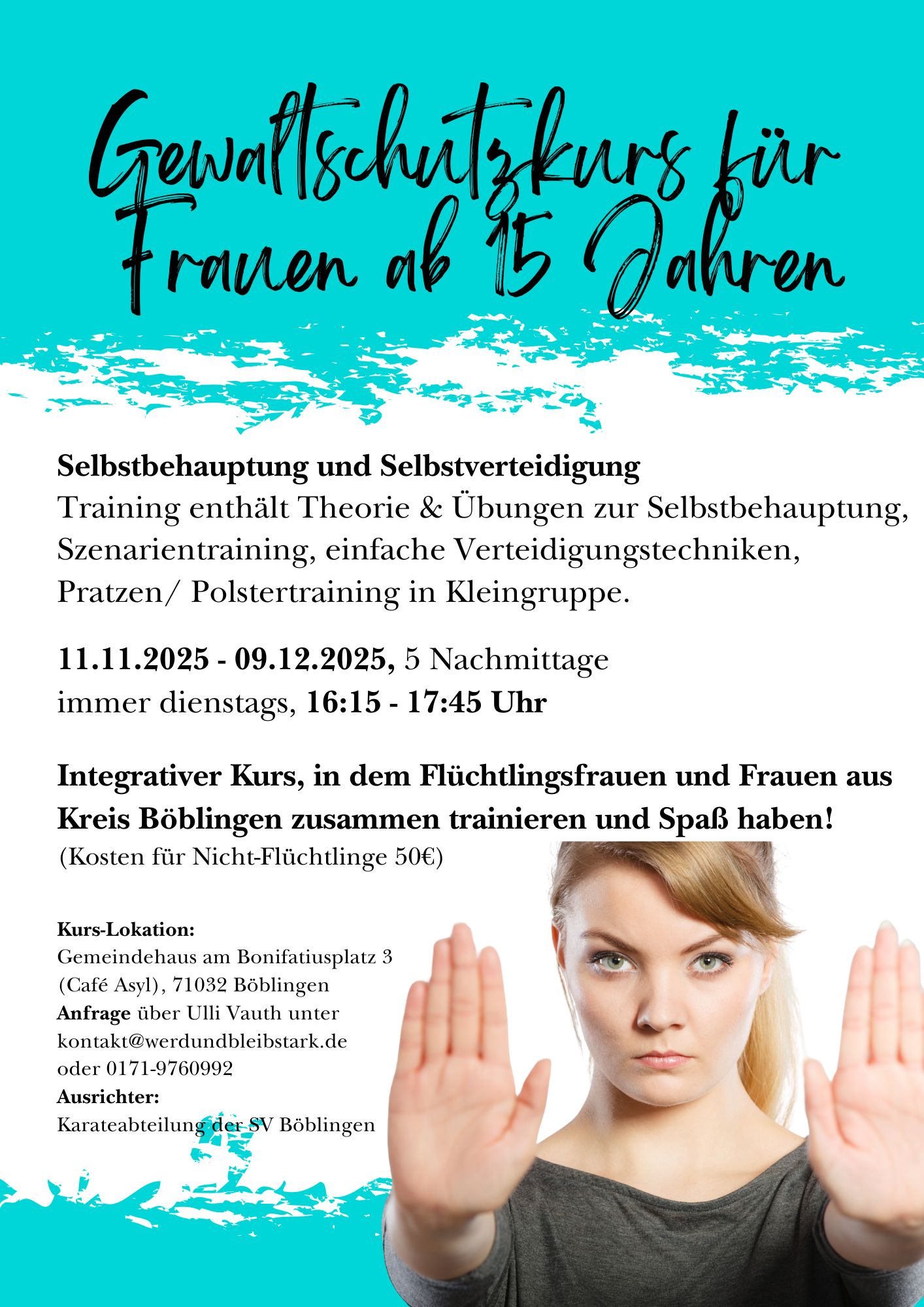 Der nächste Gewaltschutzkurs (Selbstbehauptung und Selbstverteidigung) für Frauen ab 15 Jahren findet im Rahmen einer von der SV Böblingen organisierten Integrationsmaßnahme statt. Der Kurs ist für Flüchtlingsfrauen und im Kreis Böblingen ansässige Frauen und findet in einer kleinen Gruppe statt.